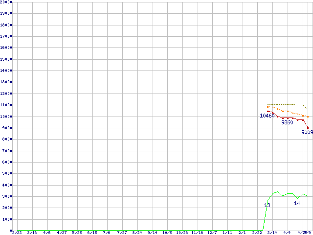 ※このグラフは過去のデータも税率5%相当に調整した税込み相当額のグラフです。 税率変更や、総額表示方式導入(2004年4月)の影響は除いています。 | | | ●凡例 | 最安値 (点線部は販売店未確認 または未調査) | 平均値 | 最高値 | ショップ数 |