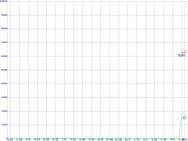 ※このグラフは過去のデータも税率5%相当に調整した税込み相当額のグラフです。 税率変更や、総額表示方式導入(2004年4月)の影響は除いています。 | | | ●凡例 | 最安値 (点線部は販売店未確認 または未調査) | 平均値 | 最高値 | ショップ数 |