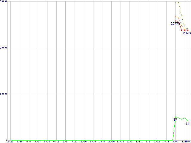 | Phenom X4 9750 (2.4GHz,L2 512KB×4,L3 2MB)の価格推移 | | | (2007年2月23日~2008年5月9日) |
