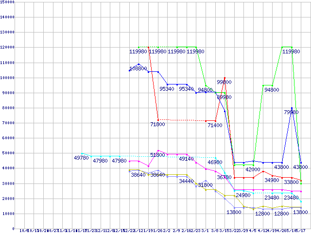 メモリ主要製品(最安値1万円以上)の最安値推移