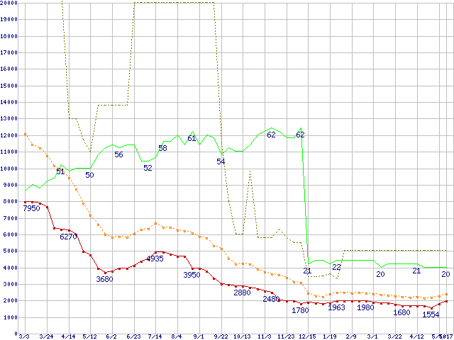 ※このグラフは過去のデータも税率5%相当に調整した税込み相当額のグラフです。 税率変更や、総額表示方式導入(2004年4月)の影響は除いています。 | | | ●凡例 | 最安値 (点線部は販売店未確認 または未調査) | 平均値 | 最高値 | ショップ数 |