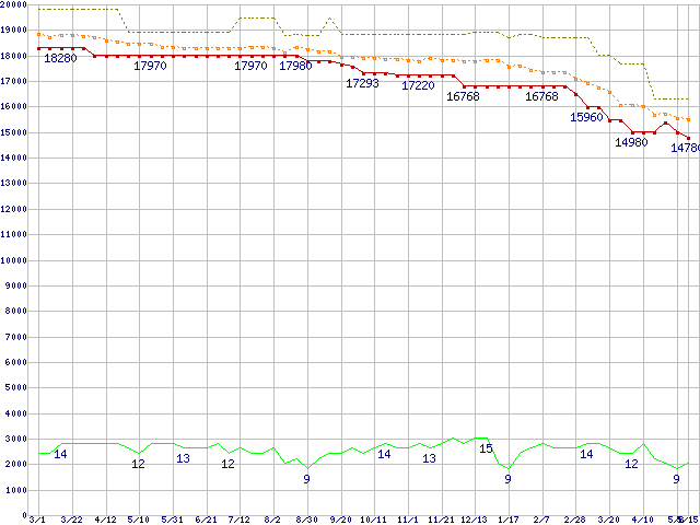 ※このグラフは過去のデータも税率5%相当に調整した税込み相当額のグラフです。 税率変更や、総額表示方式導入(2004年4月)の影響は除いています。 | | | ●凡例 | 最安値 (点線部は販売店未確認 または未調査) | 平均値 | 最高値 | ショップ数 |