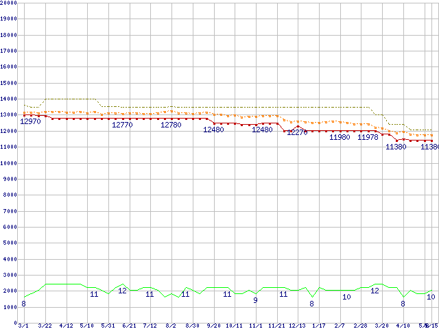 ※このグラフは過去のデータも税率5%相当に調整した税込み相当額のグラフです。 税率変更や、総額表示方式導入(2004年4月)の影響は除いています。 | | | ●凡例 | 最安値 (点線部は販売店未確認 または未調査) | 平均値 | 最高値 | ショップ数 |