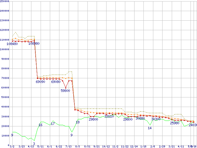 | Core 2 Quad Q6600 (2.40GHz,L2 4MB×2)の価格推移 | | | (2007年3月2日~2008年5月16日) |