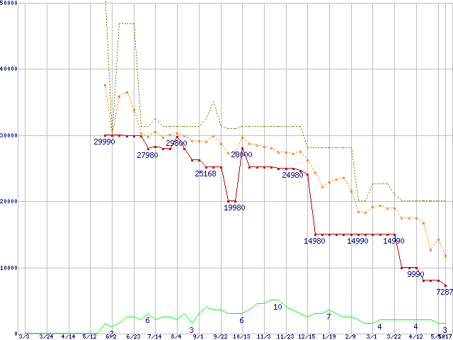 ※このグラフは過去のデータも税率5%相当に調整した税込み相当額のグラフです。 税率変更や、総額表示方式導入(2004年4月)の影響は除いています。 | | | ●凡例 | 最安値 (点線部は販売店未確認 または未調査) | 平均値 | 最高値 | ショップ数 |