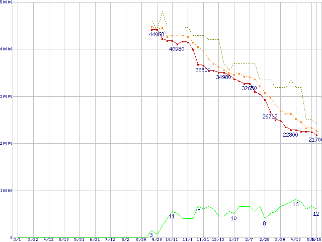 ※このグラフは過去のデータも税率5%相当に調整した税込み相当額のグラフです。 税率変更や、総額表示方式導入(2004年4月)の影響は除いています。 | | | ●凡例 | 最安値 (点線部は販売店未確認 または未調査) | 平均値 | 最高値 | ショップ数 |