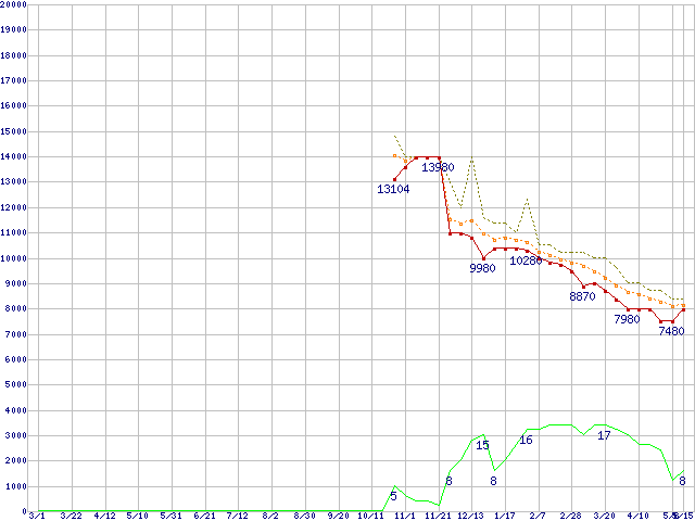 ※このグラフは過去のデータも税率5%相当に調整した税込み相当額のグラフです。 税率変更や、総額表示方式導入(2004年4月)の影響は除いています。 | | | ●凡例 | 最安値 (点線部は販売店未確認 または未調査) | 平均値 | 最高値 | ショップ数 |