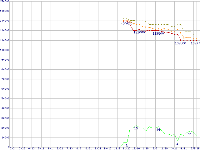 ※このグラフは過去のデータも税率5%相当に調整した税込み相当額のグラフです。 税率変更や、総額表示方式導入(2004年4月)の影響は除いています。 | | | ●凡例 | 最安値 (点線部は販売店未確認 または未調査) | 平均値 | 最高値 | ショップ数 |