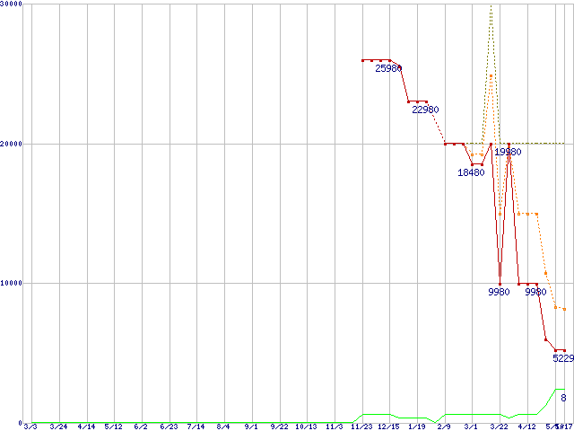 ※このグラフは過去のデータも税率5%相当に調整した税込み相当額のグラフです。 税率変更や、総額表示方式導入(2004年4月)の影響は除いています。 | | | ●凡例 | 最安値 (点線部は販売店未確認 または未調査) | 平均値 | 最高値 | ショップ数 |
