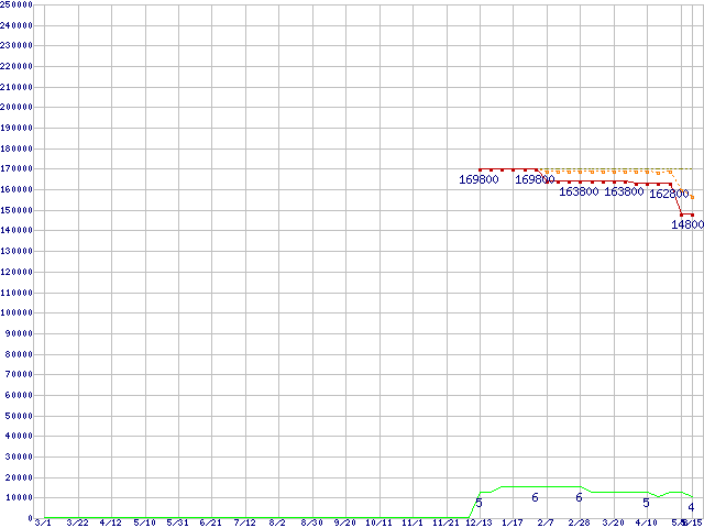 ※このグラフは過去のデータも税率5%相当に調整した税込み相当額のグラフです。 税率変更や、総額表示方式導入(2004年4月)の影響は除いています。 | | | ●凡例 | 最安値 (点線部は販売店未確認 または未調査) | 平均値 | 最高値 | ショップ数 |