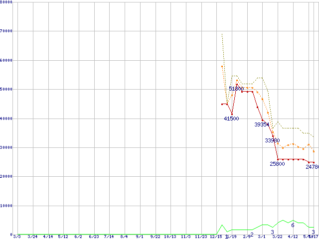 ※このグラフは過去のデータも税率5%相当に調整した税込み相当額のグラフです。 税率変更や、総額表示方式導入(2004年4月)の影響は除いています。 | | | ●凡例 | 最安値 (点線部は販売店未確認 または未調査) | 平均値 | 最高値 | ショップ数 |