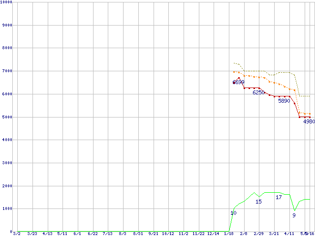 ※このグラフは過去のデータも税率5%相当に調整した税込み相当額のグラフです。 税率変更や、総額表示方式導入(2004年4月)の影響は除いています。 | | | ●凡例 | 最安値 (点線部は販売店未確認 または未調査) | 平均値 | 最高値 | ショップ数 |