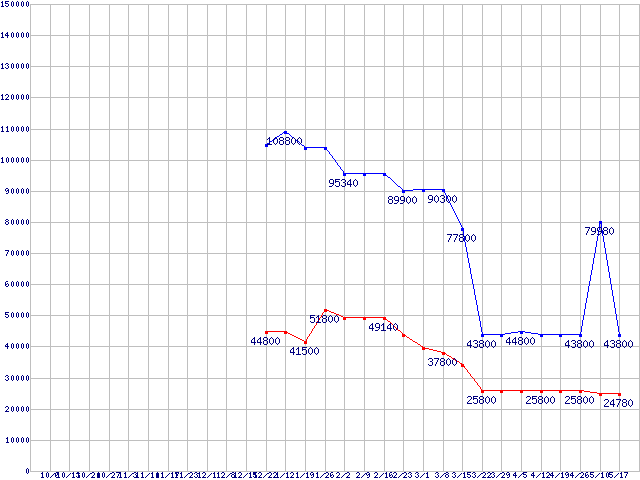 PC2-6400(DDR2-800) DDR2 SDRAM DIMMの最安値推移