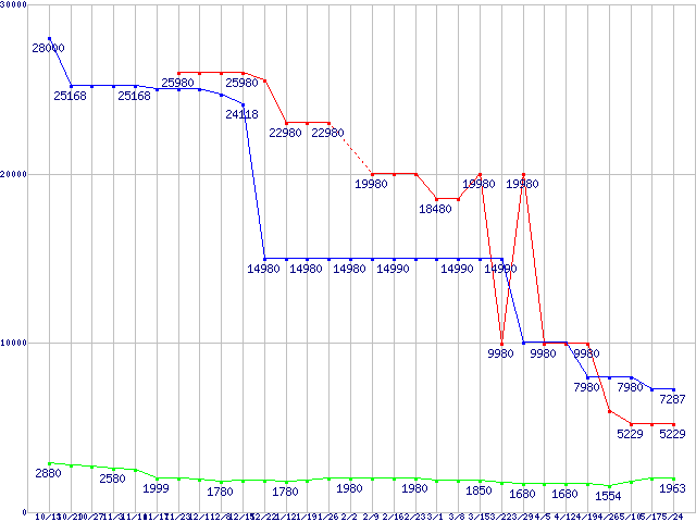 メモリ主要製品(最安値5千円未満)の最安値推移