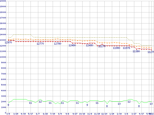 ※このグラフは過去のデータも税率5%相当に調整した税込み相当額のグラフです。 税率変更や、総額表示方式導入(2004年4月)の影響は除いています。 | | | ●凡例 | 最安値 (点線部は販売店未確認 または未調査) | 平均値 | 最高値 | ショップ数 |