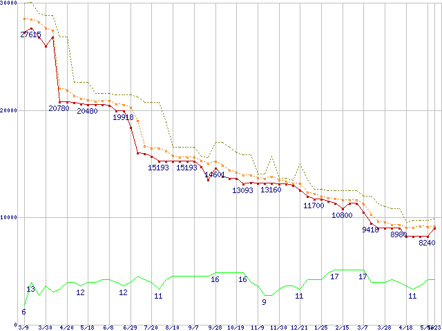 ※このグラフは過去のデータも税率5%相当に調整した税込み相当額のグラフです。 税率変更や、総額表示方式導入(2004年4月)の影響は除いています。 | | | ●凡例 | 最安値 (点線部は販売店未確認 または未調査) | 平均値 | 最高値 | ショップ数 |