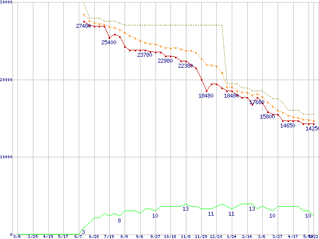 ※このグラフは過去のデータも税率5%相当に調整した税込み相当額のグラフです。 税率変更や、総額表示方式導入(2004年4月)の影響は除いています。 | | | ●凡例 | 最安値 (点線部は販売店未確認 または未調査) | 平均値 | 最高値 | ショップ数 |
