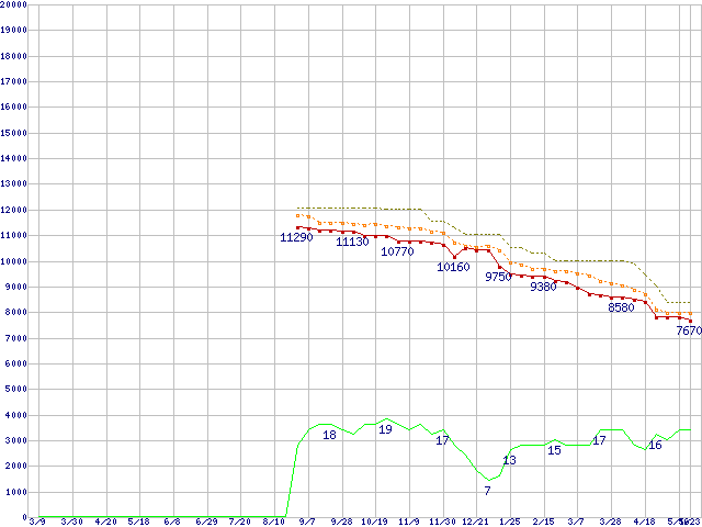 ※このグラフは過去のデータも税率5%相当に調整した税込み相当額のグラフです。 税率変更や、総額表示方式導入(2004年4月)の影響は除いています。 | | | ●凡例 | 最安値 (点線部は販売店未確認 または未調査) | 平均値 | 最高値 | ショップ数 |