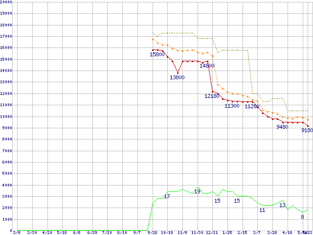 ※このグラフは過去のデータも税率5%相当に調整した税込み相当額のグラフです。 税率変更や、総額表示方式導入(2004年4月)の影響は除いています。 | | | ●凡例 | 最安値 (点線部は販売店未確認 または未調査) | 平均値 | 最高値 | ショップ数 |