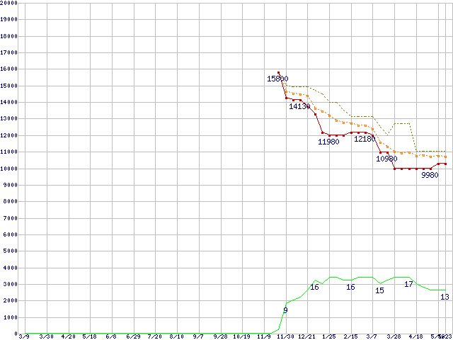| Athlon 64 X2 5200+ (2.7GHz,L2 512KB×2)の価格推移 | | | (2007年3月9日~2008年5月23日) |