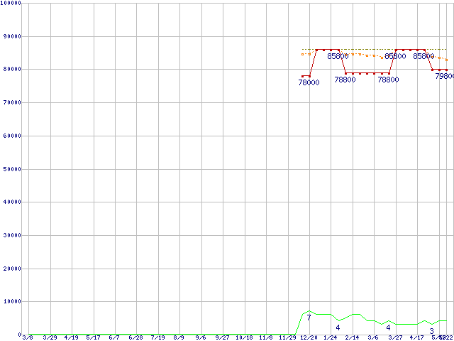 ※このグラフは過去のデータも税率5%相当に調整した税込み相当額のグラフです。 税率変更や、総額表示方式導入(2004年4月)の影響は除いています。 | | | ●凡例 | 最安値 (点線部は販売店未確認 または未調査) | 平均値 | 最高値 | ショップ数 |