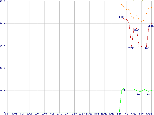 ※このグラフは過去のデータも税率5%相当に調整した税込み相当額のグラフです。 税率変更や、総額表示方式導入(2004年4月)の影響は除いています。 | | | ●凡例 | 最安値 (点線部は販売店未確認 または未調査) | 平均値 | 最高値 | ショップ数 |