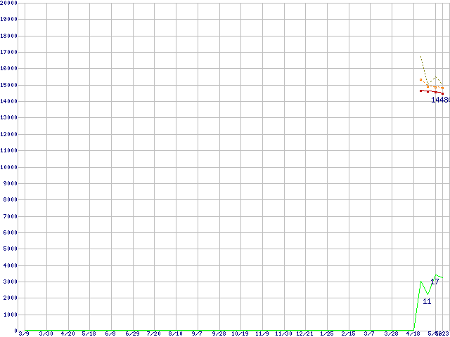 ※このグラフは過去のデータも税率5%相当に調整した税込み相当額のグラフです。 税率変更や、総額表示方式導入(2004年4月)の影響は除いています。 | | | ●凡例 | 最安値 (点線部は販売店未確認 または未調査) | 平均値 | 最高値 | ショップ数 |