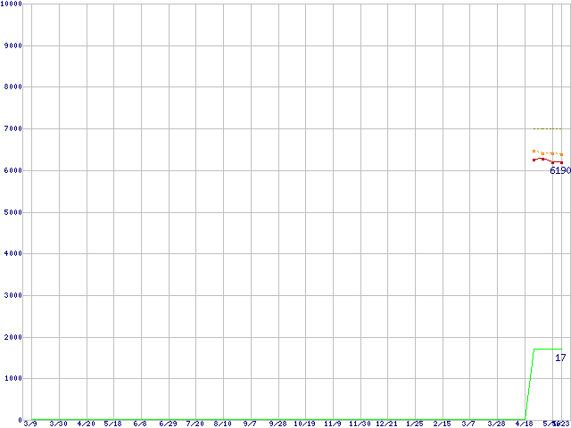 ※このグラフは過去のデータも税率5%相当に調整した税込み相当額のグラフです。 税率変更や、総額表示方式導入(2004年4月)の影響は除いています。 | | | ●凡例 | 最安値 (点線部は販売店未確認 または未調査) | 平均値 | 最高値 | ショップ数 |