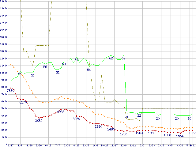 ※このグラフは過去のデータも税率5%相当に調整した税込み相当額のグラフです。 税率変更や、総額表示方式導入(2004年4月)の影響は除いています。 | | | ●凡例 | 最安値 (点線部は販売店未確認 または未調査) | 平均値 | 最高値 | ショップ数 |