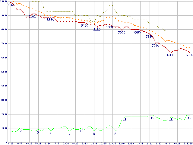 ※このグラフは過去のデータも税率5%相当に調整した税込み相当額のグラフです。 税率変更や、総額表示方式導入(2004年4月)の影響は除いています。 | | | ●凡例 | 最安値 (点線部は販売店未確認 または未調査) | 平均値 | 最高値 | ショップ数 |