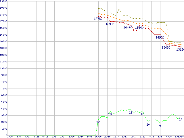 ※このグラフは過去のデータも税率5%相当に調整した税込み相当額のグラフです。 税率変更や、総額表示方式導入(2004年4月)の影響は除いています。 | | | ●凡例 | 最安値 (点線部は販売店未確認 または未調査) | 平均値 | 最高値 | ショップ数 |