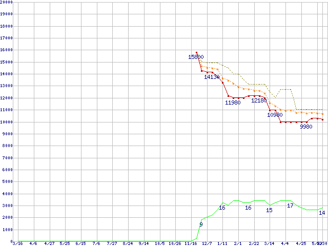 ※このグラフは過去のデータも税率5%相当に調整した税込み相当額のグラフです。 税率変更や、総額表示方式導入(2004年4月)の影響は除いています。 | | | ●凡例 | 最安値 (点線部は販売店未確認 または未調査) | 平均値 | 最高値 | ショップ数 |
