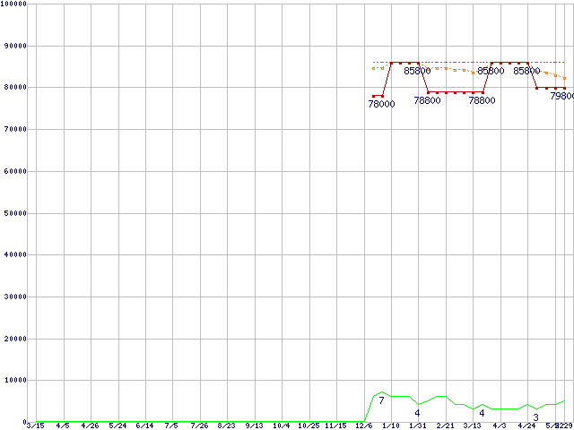 ※このグラフは過去のデータも税率5%相当に調整した税込み相当額のグラフです。 税率変更や、総額表示方式導入(2004年4月)の影響は除いています。 | | | ●凡例 | 最安値 (点線部は販売店未確認 または未調査) | 平均値 | 最高値 | ショップ数 |