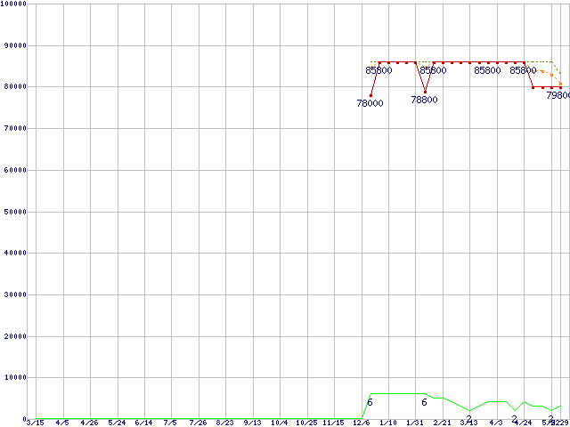 ※このグラフは過去のデータも税率5%相当に調整した税込み相当額のグラフです。 税率変更や、総額表示方式導入(2004年4月)の影響は除いています。 | | | ●凡例 | 最安値 (点線部は販売店未確認 または未調査) | 平均値 | 最高値 | ショップ数 |