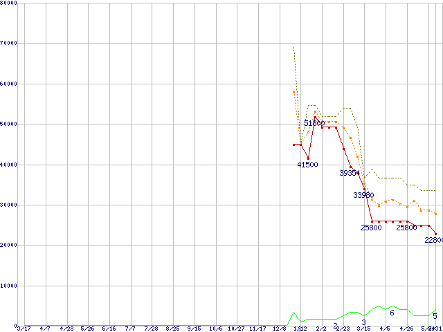 ※このグラフは過去のデータも税率5%相当に調整した税込み相当額のグラフです。 税率変更や、総額表示方式導入(2004年4月)の影響は除いています。 | | | ●凡例 | 最安値 (点線部は販売店未確認 または未調査) | 平均値 | 最高値 | ショップ数 |