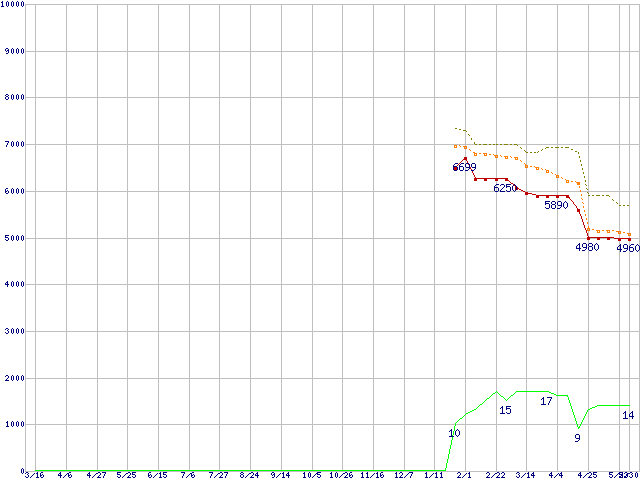 ※このグラフは過去のデータも税率5%相当に調整した税込み相当額のグラフです。 税率変更や、総額表示方式導入(2004年4月)の影響は除いています。 | | | ●凡例 | 最安値 (点線部は販売店未確認 または未調査) | 平均値 | 最高値 | ショップ数 |
