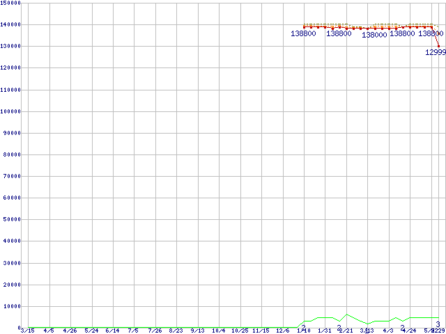 ※このグラフは過去のデータも税率5%相当に調整した税込み相当額のグラフです。 税率変更や、総額表示方式導入(2004年4月)の影響は除いています。 | | | ●凡例 | 最安値 (点線部は販売店未確認 または未調査) | 平均値 | 最高値 | ショップ数 |