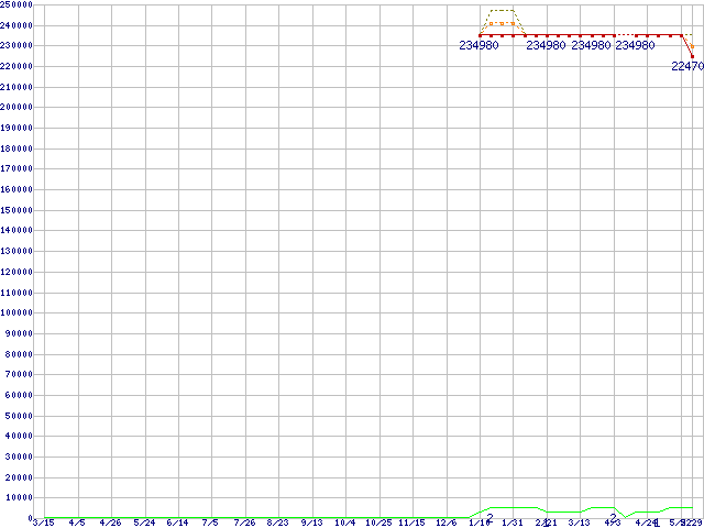 ※このグラフは過去のデータも税率5%相当に調整した税込み相当額のグラフです。 税率変更や、総額表示方式導入(2004年4月)の影響は除いています。 | | | ●凡例 | 最安値 (点線部は販売店未確認 または未調査) | 平均値 | 最高値 | ショップ数 |
