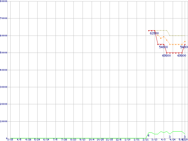 ※このグラフは過去のデータも税率5%相当に調整した税込み相当額のグラフです。 税率変更や、総額表示方式導入(2004年4月)の影響は除いています。 | | | ●凡例 | 最安値 (点線部は販売店未確認 または未調査) | 平均値 | 最高値 | ショップ数 |