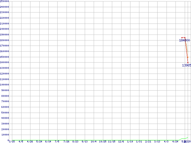 ※このグラフは過去のデータも税率5%相当に調整した税込み相当額のグラフです。 税率変更や、総額表示方式導入(2004年4月)の影響は除いています。 | | | ●凡例 | 最安値 (点線部は販売店未確認 または未調査) | 平均値 | 最高値 | ショップ数 |
