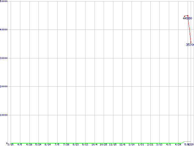 ※このグラフは過去のデータも税率5%相当に調整した税込み相当額のグラフです。 税率変更や、総額表示方式導入(2004年4月)の影響は除いています。 | | | ●凡例 | 最安値 (点線部は販売店未確認 または未調査) | 平均値 | 最高値 | ショップ数 |
