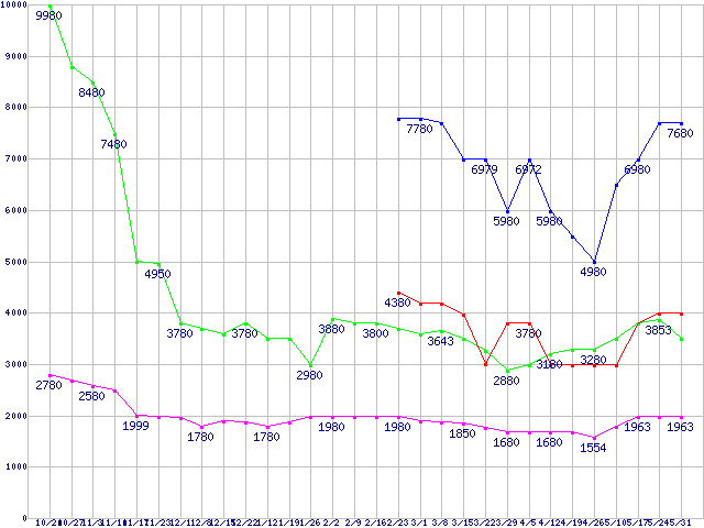PC2-6400(DDR2-800) DDR2 SDRAM DIMMの最安値推移
