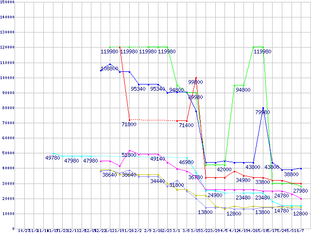 メモリ主要製品(最安値1万円以上)の最安値推移