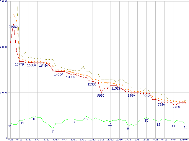 ※このグラフは過去のデータも税率5%相当に調整した税込み相当額のグラフです。 税率変更や、総額表示方式導入(2004年4月)の影響は除いています。 | | | ●凡例 | 最安値 (点線部は販売店未確認 または未調査) | 平均値 | 最高値 | ショップ数 |