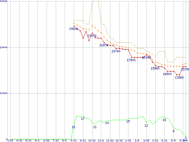 ※このグラフは過去のデータも税率5%相当に調整した税込み相当額のグラフです。 税率変更や、総額表示方式導入(2004年4月)の影響は除いています。 | | | ●凡例 | 最安値 (点線部は販売店未確認 または未調査) | 平均値 | 最高値 | ショップ数 |