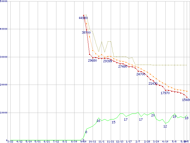 ※このグラフは過去のデータも税率5%相当に調整した税込み相当額のグラフです。 税率変更や、総額表示方式導入(2004年4月)の影響は除いています。 | | | ●凡例 | 最安値 (点線部は販売店未確認 または未調査) | 平均値 | 最高値 | ショップ数 |