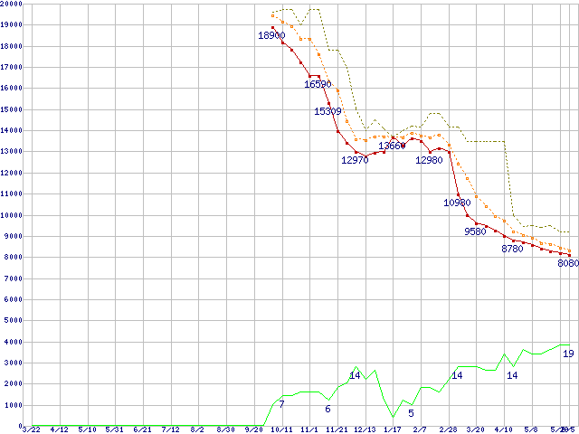 ※このグラフは過去のデータも税率5%相当に調整した税込み相当額のグラフです。 税率変更や、総額表示方式導入(2004年4月)の影響は除いています。 | | | ●凡例 | 最安値 (点線部は販売店未確認 または未調査) | 平均値 | 最高値 | ショップ数 |