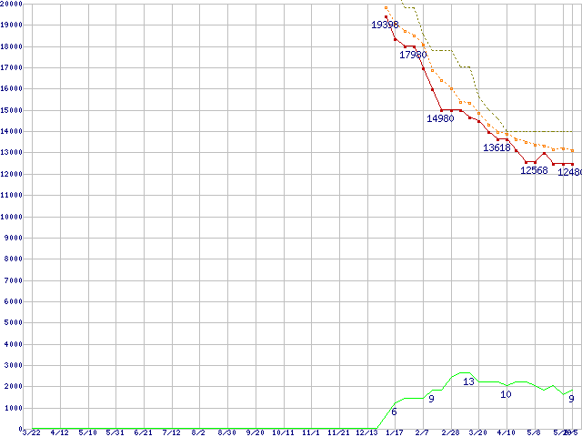 ※このグラフは過去のデータも税率5%相当に調整した税込み相当額のグラフです。 税率変更や、総額表示方式導入(2004年4月)の影響は除いています。 | | | ●凡例 | 最安値 (点線部は販売店未確認 または未調査) | 平均値 | 最高値 | ショップ数 |