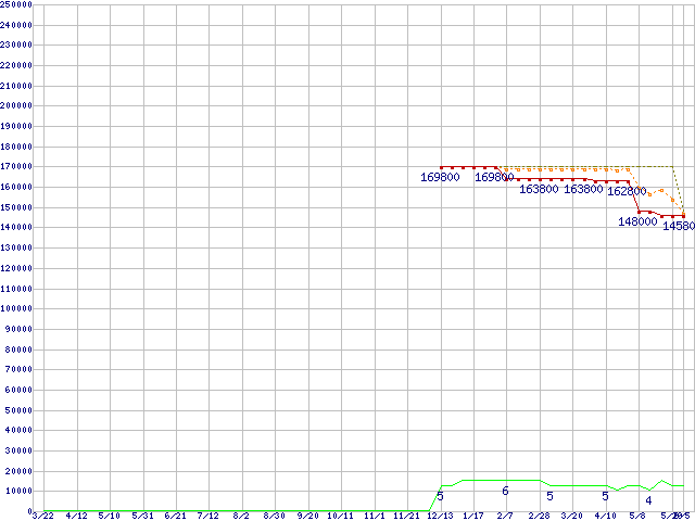 ※このグラフは過去のデータも税率5%相当に調整した税込み相当額のグラフです。 税率変更や、総額表示方式導入(2004年4月)の影響は除いています。 | | | ●凡例 | 最安値 (点線部は販売店未確認 または未調査) | 平均値 | 最高値 | ショップ数 |