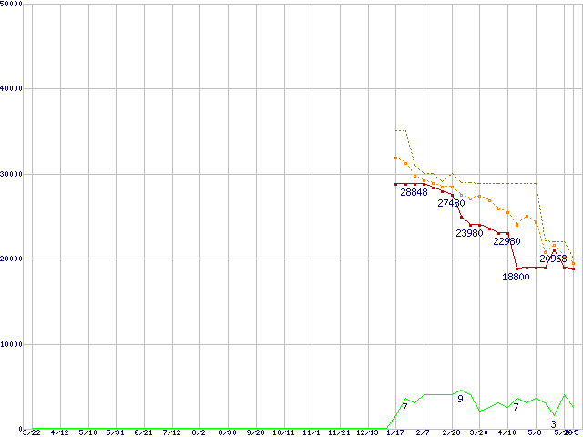 ※このグラフは過去のデータも税率5%相当に調整した税込み相当額のグラフです。 税率変更や、総額表示方式導入(2004年4月)の影響は除いています。 | | | ●凡例 | 最安値 (点線部は販売店未確認 または未調査) | 平均値 | 最高値 | ショップ数 |